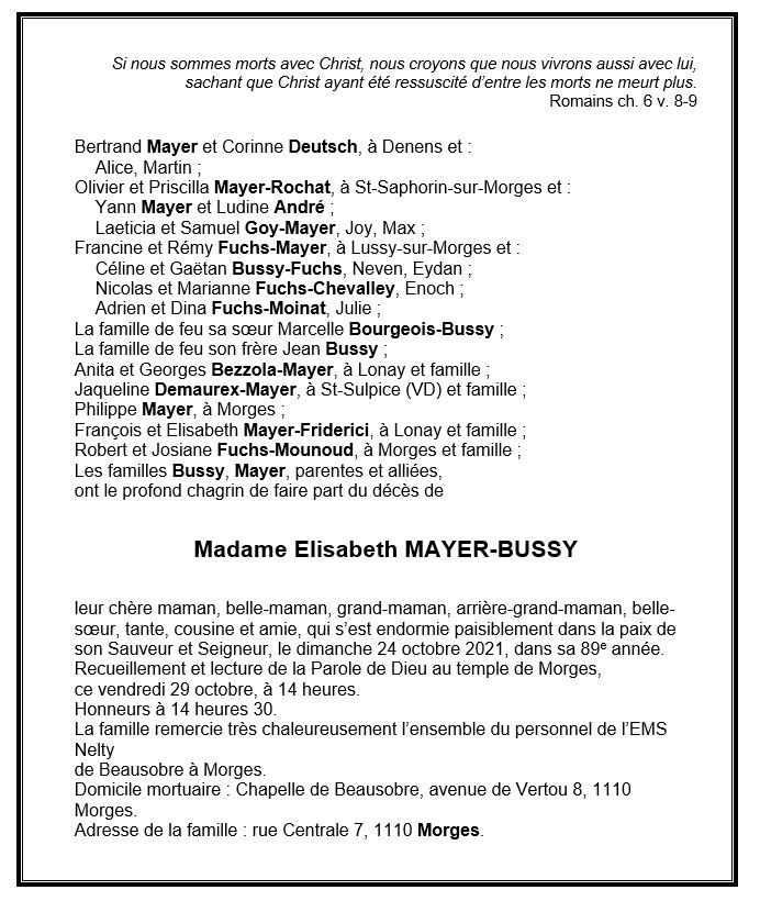 Madame Elisabeth MAYER-BUSSY 14 déc. 1932 - 24 oct. 2021 Avis mortuaire PFG Télecharger PDF Partager sur: Galerie PreviousNext PreviousNext