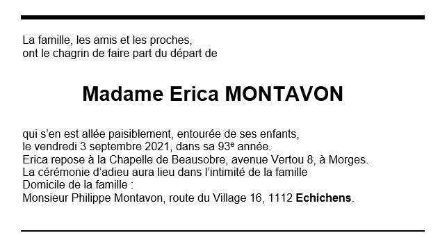 Madame Erica MONTAVON 22 nov. 1929 - 03 sep. 2021 Avis mortuaire PFG Télecharger PDF Partager sur: Galerie PreviousNext PreviousNext