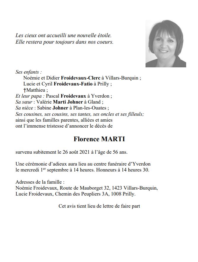 Madame Florence MARTI 14 déc. 1964 - 26 aoû. 2021 Avis mortuaire PFG Télecharger PDF Partager sur: Galerie PreviousNext PreviousNext