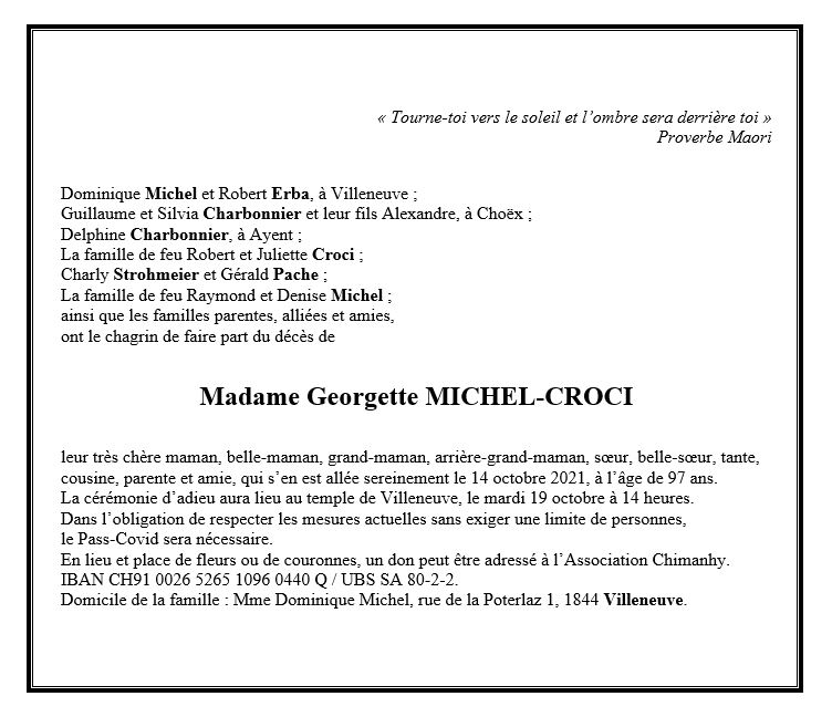 Madame Georgette MICHEL-CROCI 02 sep. 1924 - 14 oct. 2021 Avis mortuaire PFG Télecharger PDF Partager sur: Galerie PreviousNext PreviousNext