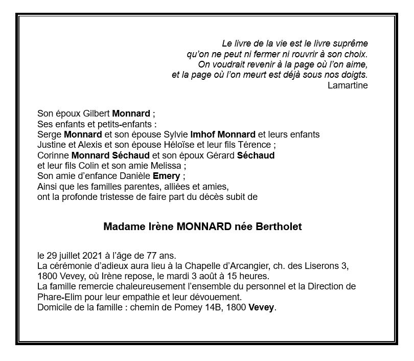 Madame Irène MONNARD 09 déc. 1943 - 29 juil. 2021 Avis mortuaire PFG Télecharger PDF Partager sur: Galerie PreviousNext PreviousNext