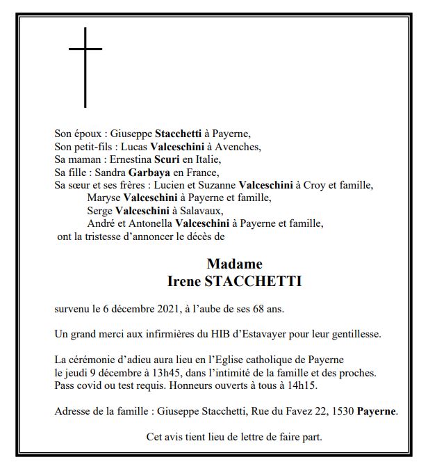 Madame Irene STACCHETTI 15 déc. 1953 - 06 déc. 2021 Avis mortuaire PFG Télecharger PDF Partager sur: Galerie PreviousNext PreviousNext