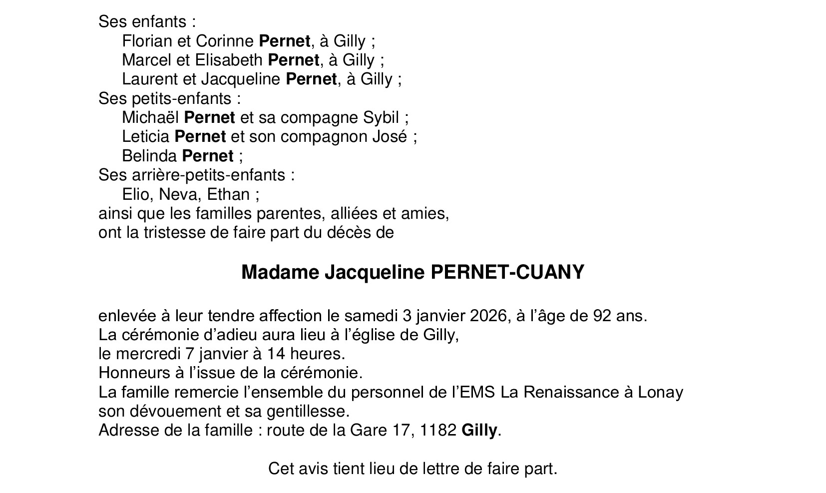 Madame Jacqueline PERNET