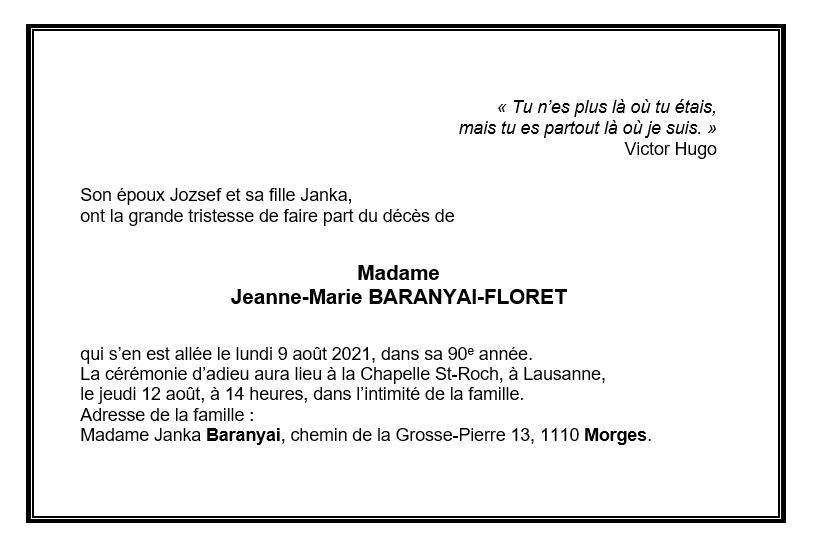 Madame Jeanne-Marie BARANYAI-FLORET 09 aoû. 1932 - 09 aoû. 2021 Avis mortuaire PFG Télecharger PDF Partager sur: Galerie PreviousNext PreviousNext