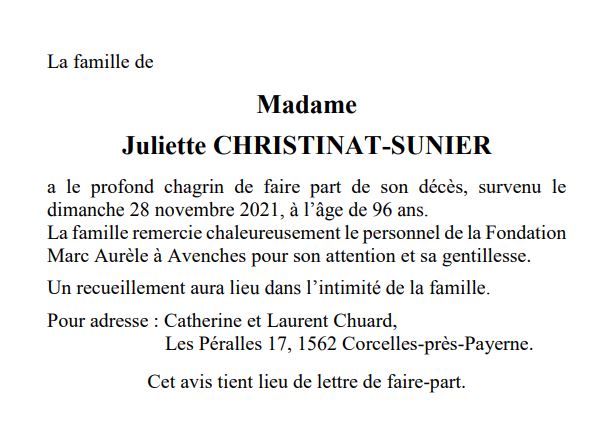 Madame Juliette CHRISTINAT-SUNIER 05 mar. 1925 - 28 nov. 2021 Avis mortuaire PFG Télecharger PDF Partager sur: Galerie