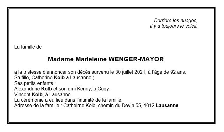 Madame Madeleine WENGER-MAYOR 24 jan. 1929 - 30 juil. 2021 Avis mortuaire PFG Télecharger PDF Partager sur: Galerie