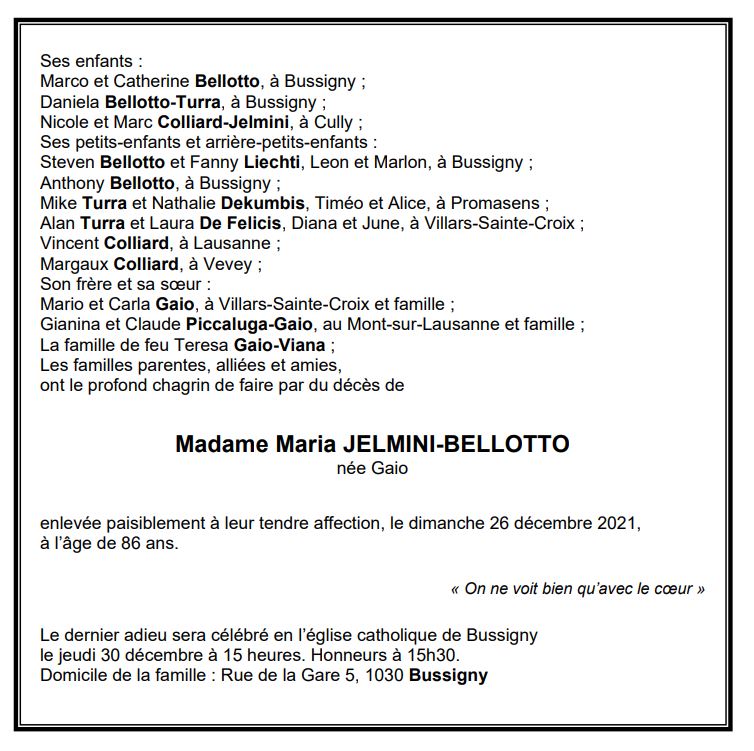 Madame Maria JELMINI-BELLOTTO 10 mai. 1935 - 26 déc. 2021 Avis mortuaire PFG Télecharger PDF Partager sur: Galerie PreviousNext PreviousNext