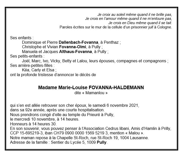 Madame Marie-Louise FOVANNA-HALDEMANN 06 mar. 1930 - 06 nov. 2021 Avis mortuaire PFG Télecharger PDF Partager sur: Galerie PreviousNext PreviousNext