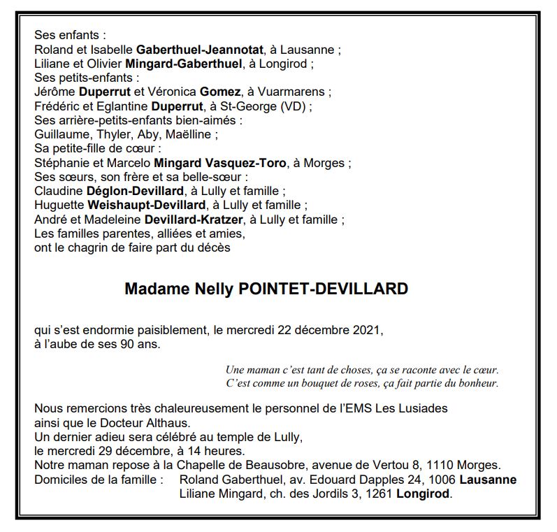 Madame Nelly POINTET-DEVILLARD 01 fév. 1932 - 22 déc. 2021 Avis mortuaire PFG Télecharger PDF Partager sur: Galerie PreviousNext PreviousNext