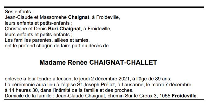 Madame Renée CHAIGNAT-CHALLET 18 sep. 1932 - 02 déc. 2021 Avis mortuaire PFG Télecharger PDF Partager sur: Galerie PreviousNext PreviousNext