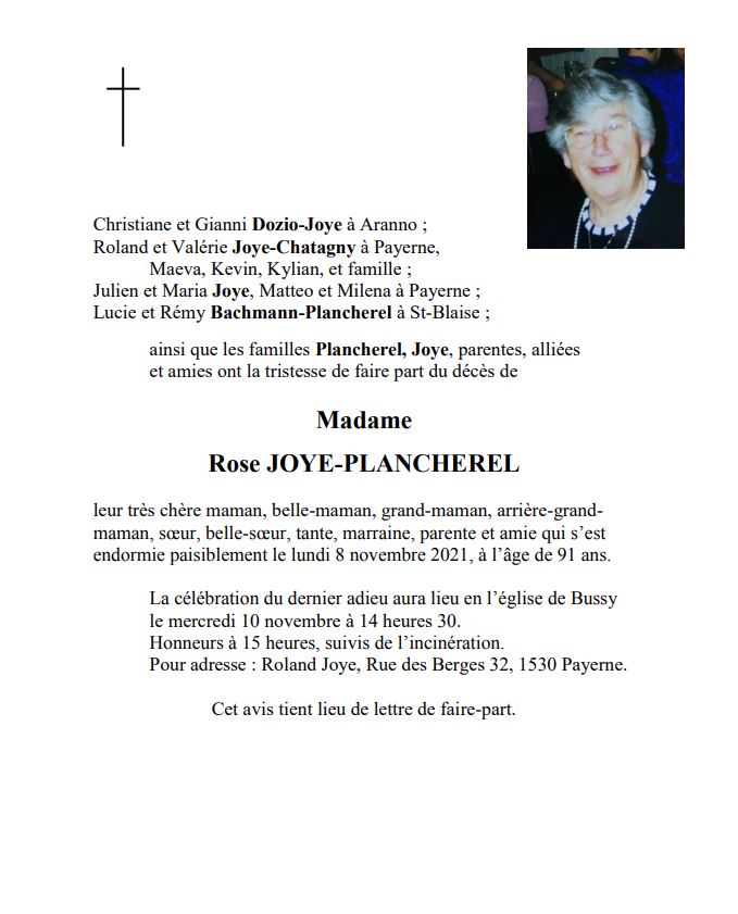 Madame Rose JOYE-PLANCHEREL 04 juil. 1930 - 08 nov. 2021 Avis mortuaire PFG Télecharger PDF Partager sur: Galerie PreviousNext PreviousNext