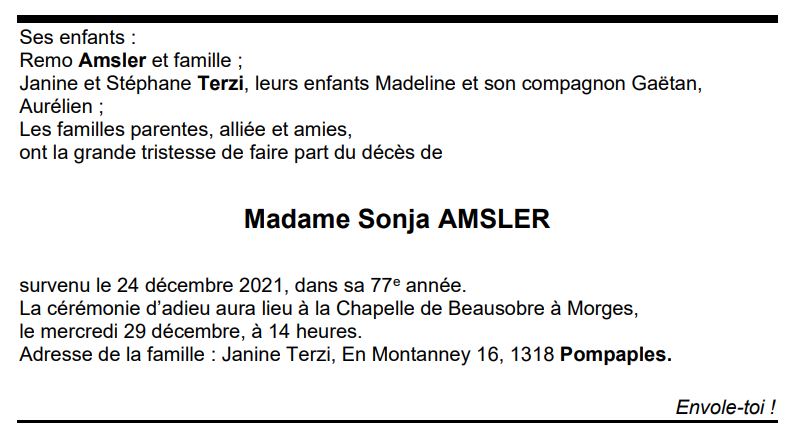 Madame Sonja AMSLER 03 aoû. 1945 - 24 déc. 2021 Avis mortuaire PFG Télecharger PDF Partager sur: Galerie PreviousNext PreviousNext