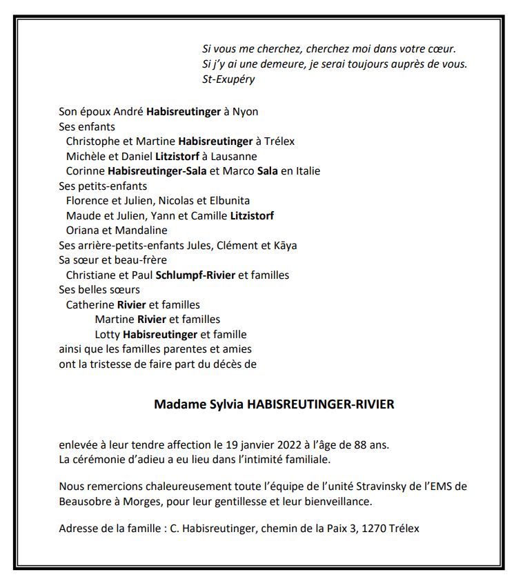 Madame Sylvia HABISREUTINGER-RIVIER 20 mar. 1933 - 19 jan. 2022 Avis mortuaire PFG Télecharger PDF Partager sur: Galerie PreviousNext PreviousNext