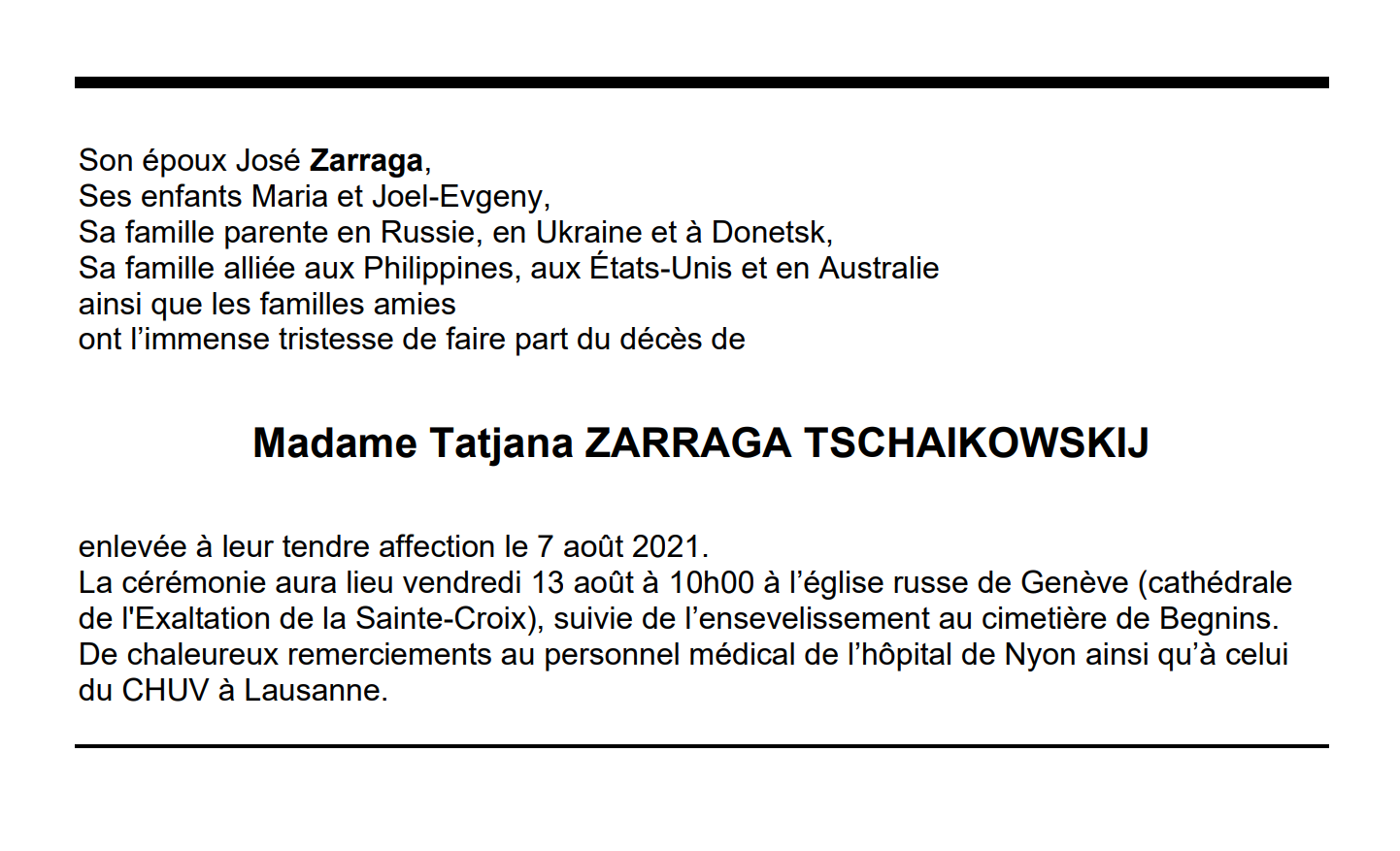 Madame Tatjana ZARRAGA TSCHAIKOWSKIJ 22 mar. 1946 - 07 aoû. 2021 Avis mortuaire PFG Télecharger PDF Partager sur: Galerie PreviousNext PreviousNext