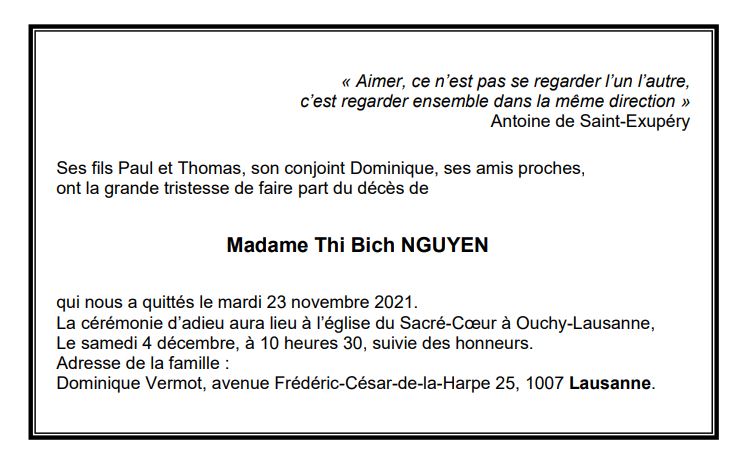 Madame Thi Bich NGUYEN 29 oct. 1959 - 23 nov. 2021 Avis mortuaire PFG Télecharger PDF Partager sur: Galerie PreviousNext PreviousNext