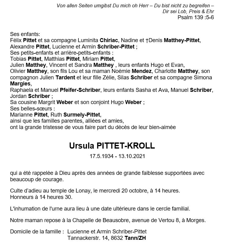 Madame Ursula PITTET-KROLL 17 mai. 1934 - 13 oct. 2021 Avis mortuaire PFG Télecharger PDF Partager sur: Galerie PreviousNext PreviousNext