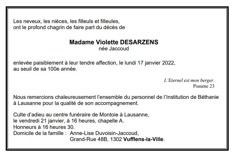 Madame Violette DESARZENS 30 aoû. 1922 - 17 jan. 2022 Avis mortuaire PFG Télecharger PDF Partager sur: Galerie PreviousNext PreviousNext