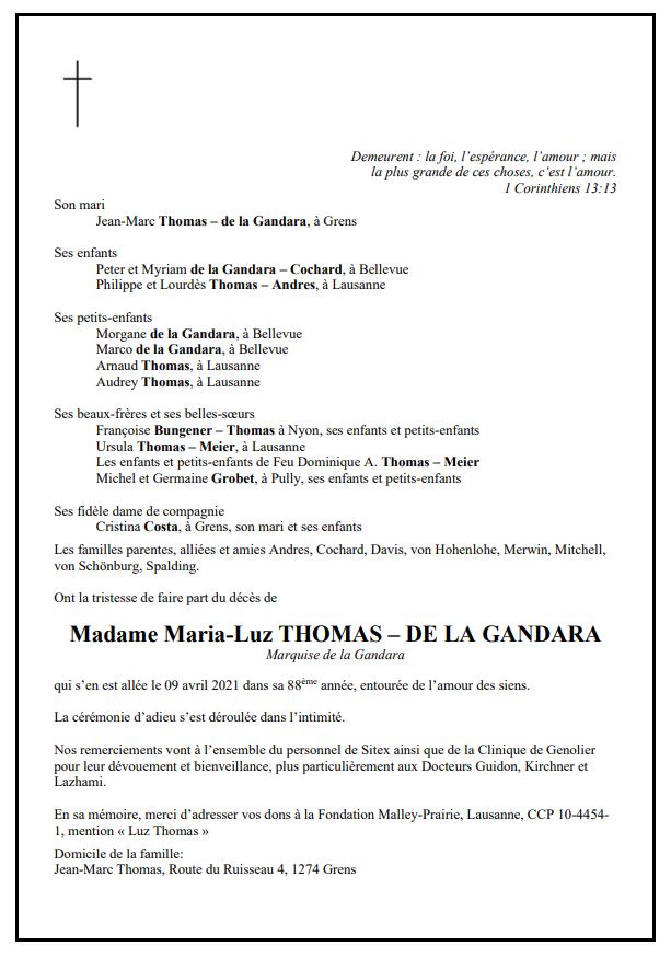 Maria-Luz THOMAS-DE LA GANDARA 07 jan. 1934 - 09 avr. 2021 Avis mortuaire PFG Télecharger PDF Partager sur: Galerie PreviousNext PreviousNext