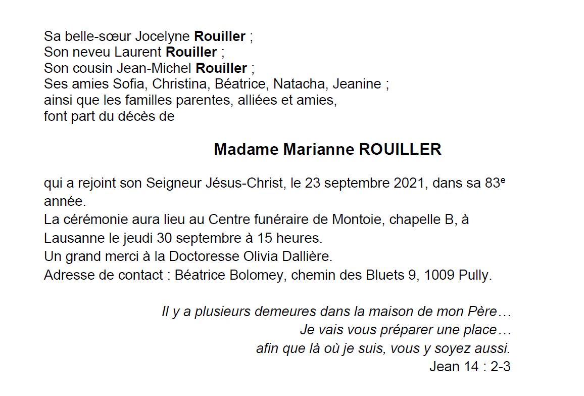 Marianne ROUILLER 28 déc. 1938 - 23 sep. 2021 Avis mortuaire PFG Télecharger PDF Partager sur: Galerie PreviousNext PreviousNext
