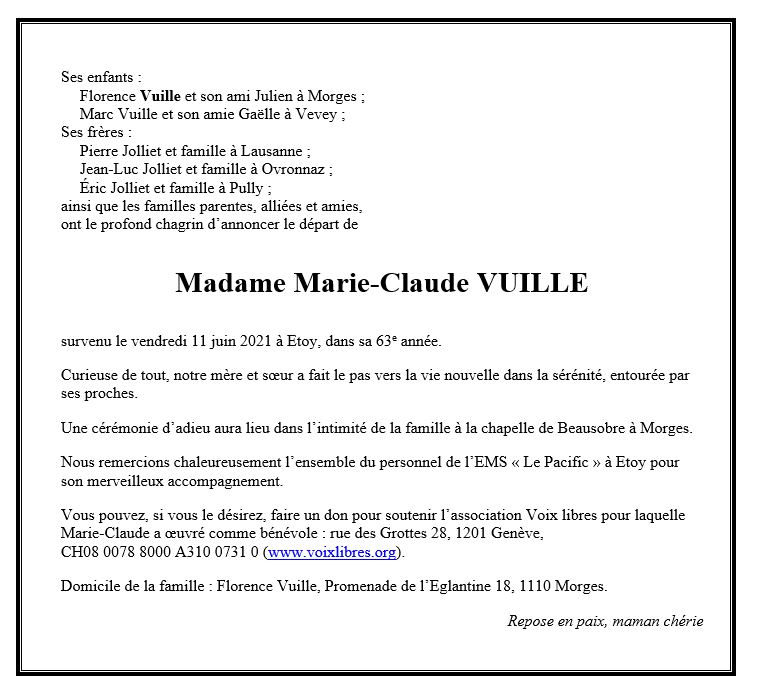 Marie-Claude VUILLE 05 fév. 1959 - 11 juin. 2021 Avis mortuaire PFG Télecharger PDF Partager sur: Galerie PreviousNext PreviousNext