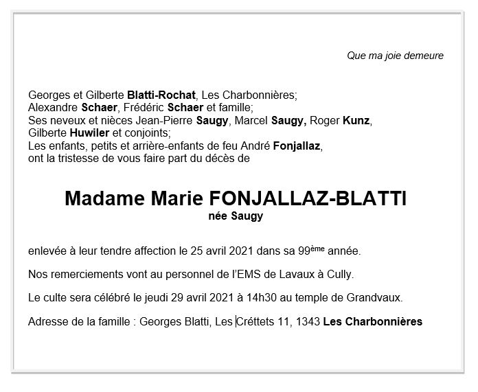 Marie FONJALLAZ-BLATTI 25 jan. 1923 - 25 avr. 2021 Avis mortuaire PFG Télecharger PDF Partager sur: Galerie PreviousNext PreviousNext