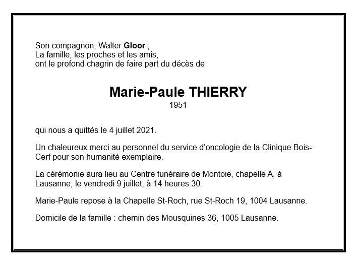 Marie-Paule THIERRY 07 oct. 1951 - 04 juil. 2021 Avis mortuaire PFG Télecharger PDF Partager sur: Galerie PreviousNext PreviousNext