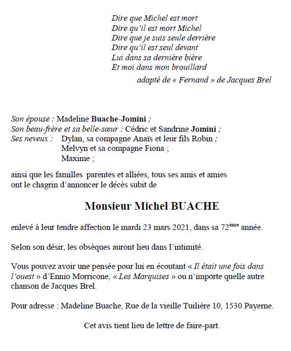 Michel BUACHE 07 oct. 1949 - 23 mar. 2021 Avis mortuaire PFG Télecharger PDF Partager sur: Galerie PreviousNext PreviousNext