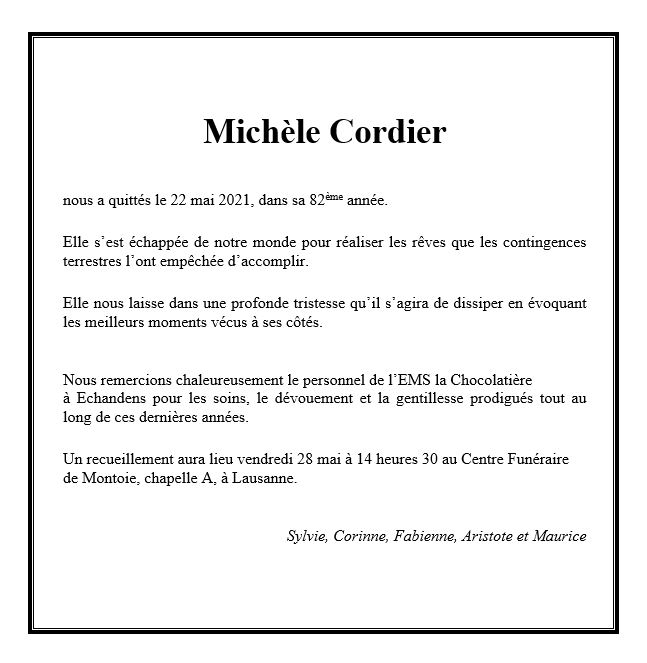 Michèle CORDIER 03 sep. 1939 - 22 mai. 2021 Avis mortuaire PFG Télecharger PDF Partager sur: Galerie PreviousNext PreviousNext