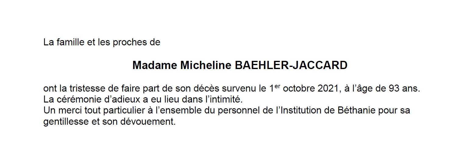 Micheline Baehler 31 jan. 1928 - 01 oct. 2021 Avis mortuaire PFG Télecharger PDF Partager sur: Galerie PreviousNext PreviousNext