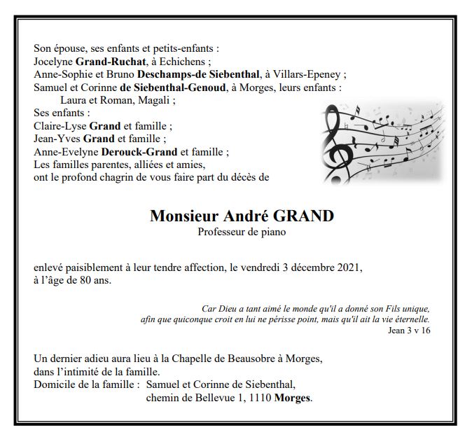Monsieur André GRAND 11 aoû. 1941 - 03 déc. 2021 Avis mortuaire PFG Télecharger PDF Partager sur: Galerie PreviousNext PreviousNext