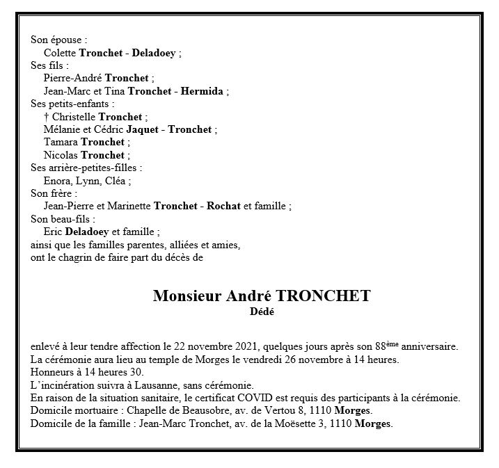 Monsieur André TRONCHET 03 nov. 1933 - 22 nov. 2021 Avis mortuaire PFG Télecharger PDF Partager sur: Galerie PreviousNext PreviousNext