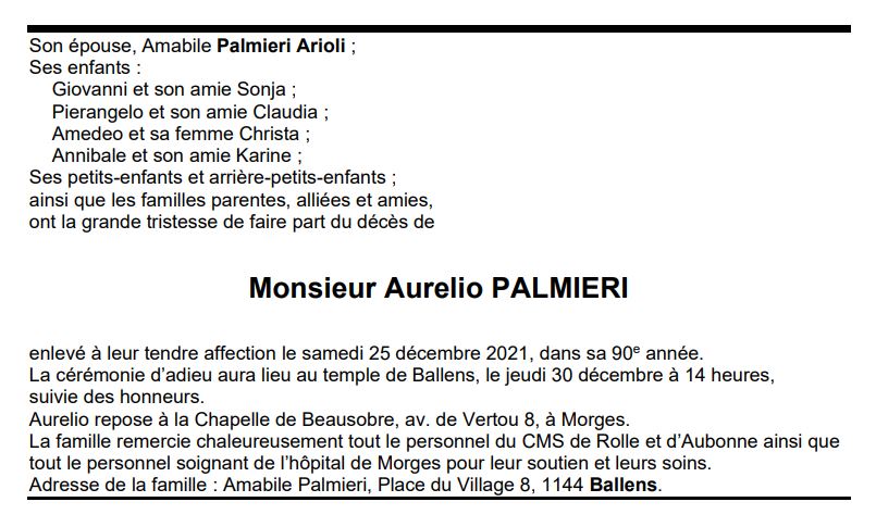 Monsieur Aurelio PALMIERI 02 fév. 1932 - 25 déc. 2021 Avis mortuaire PFG Télecharger PDF Partager sur: Galerie PreviousNext PreviousNext