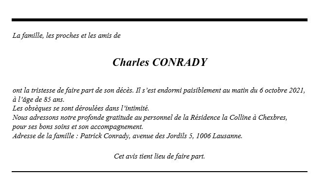 Monsieur Charles CONRADY 10 jan. 1936 - 06 oct. 2021 Avis mortuaire PFG Télecharger PDF Partager sur: Galerie PreviousNext PreviousNext