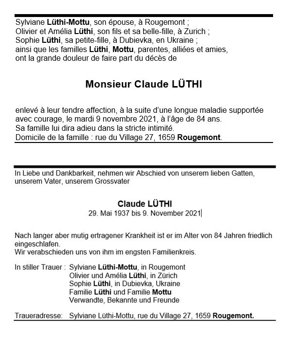 Monsieur Claude LUTHI 29 mai. 1937 - 09 nov. 2021 Avis mortuaire PFG Télecharger PDF Partager sur: Galerie PreviousNext PreviousNext