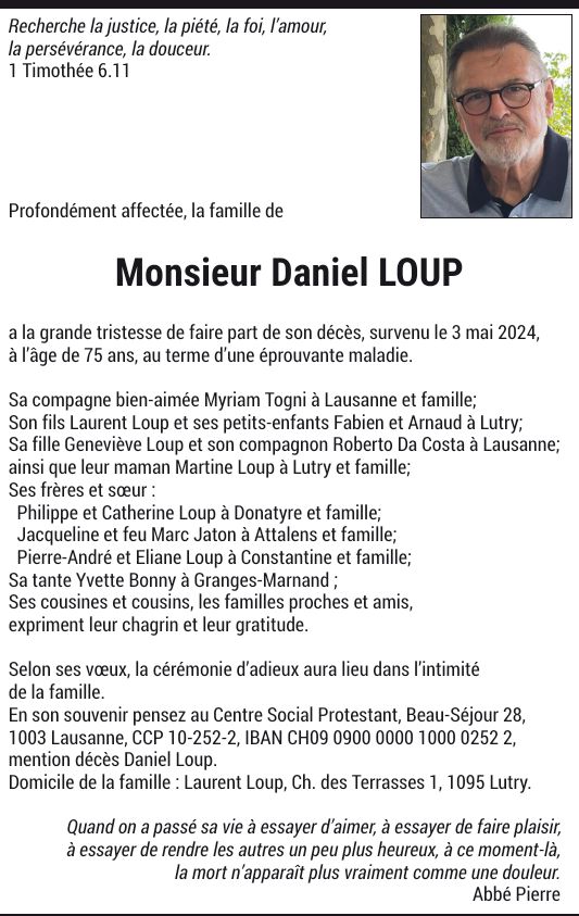 Monsieur Daniel LOUP 16 avr. 1949 - 03 mai. 2024 Avis mortuaire PFG Télecharger PDF Partager sur: Galerie PreviousNext PreviousNext