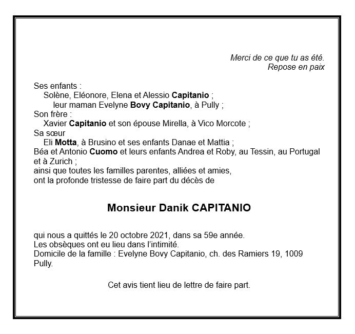 Monsieur Danik CAPITANIO 11 oct. 1963 - 20 oct. 2021 Avis mortuaire PFG Télecharger PDF Partager sur: Galerie PreviousNext PreviousNext