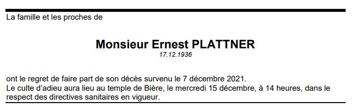 Monsieur Ernest PLATTNER 17 déc. 1936 - 07 déc. 2021 Avis mortuaire PFG Télecharger PDF Partager sur: Galerie PreviousNext PreviousNext