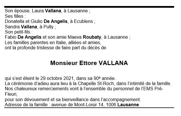 Monsieur Ettore VALLANA 31 déc. 1931 - 29 oct. 2021 Avis mortuaire PFG Télecharger PDF Partager sur: Galerie PreviousNext PreviousNext