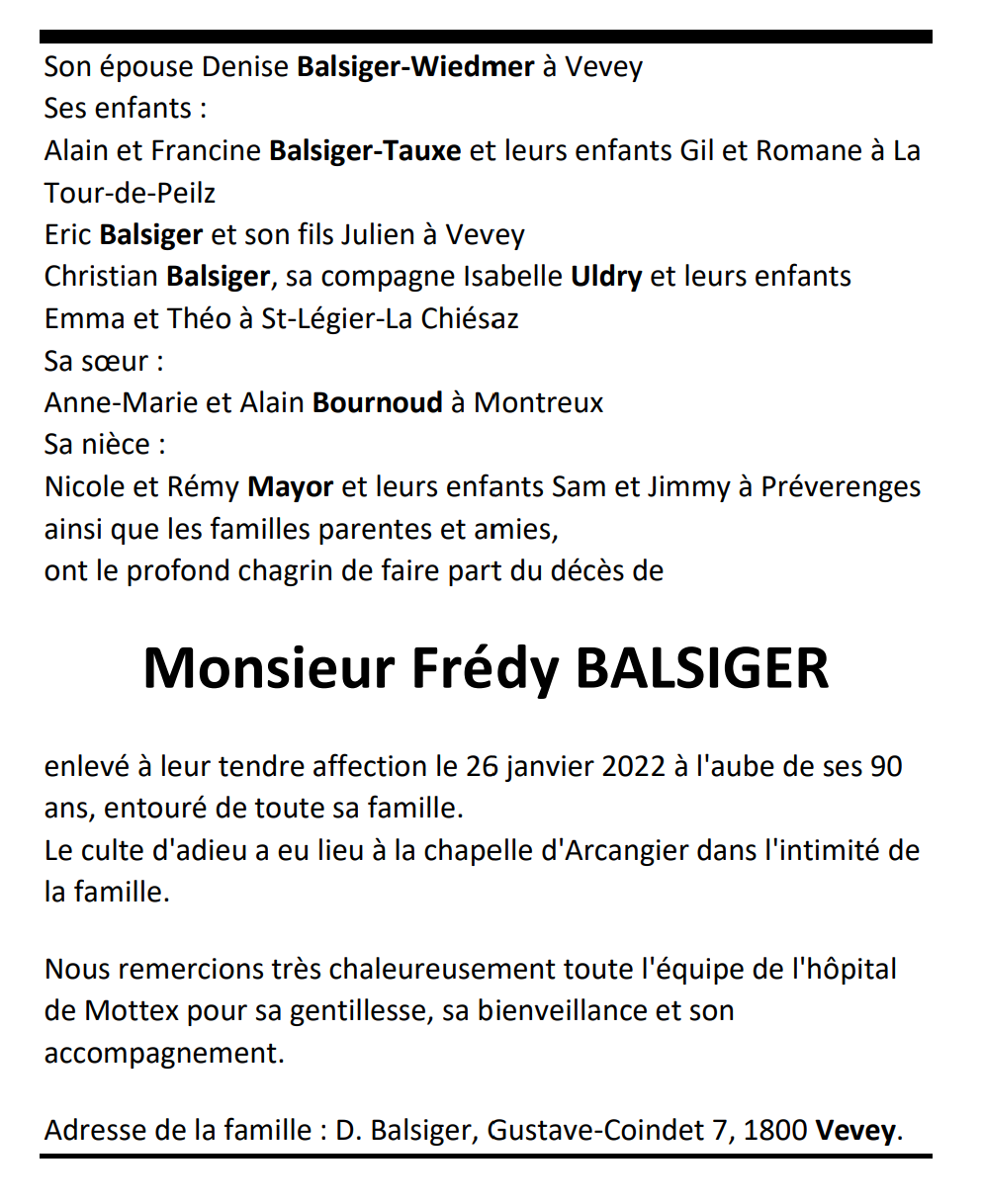 Monsieur Frédy BALSIGER 29 jan. 1932 - 26 fév. 2022 Avis mortuaire PFG Télecharger PDF Partager sur: Galerie PreviousNext PreviousNext