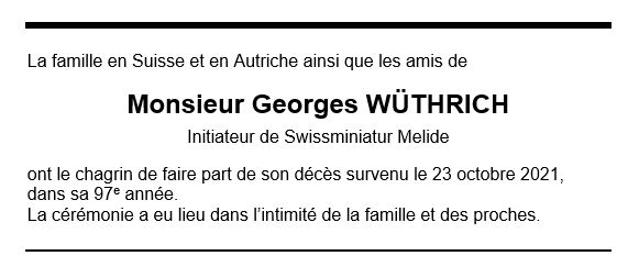 Monsieur Georges WÜTHRICH 06 nov. 1924 - 23 oct. 2021 Avis mortuaire PFG Télecharger PDF Partager sur: Galerie PreviousNext PreviousNext