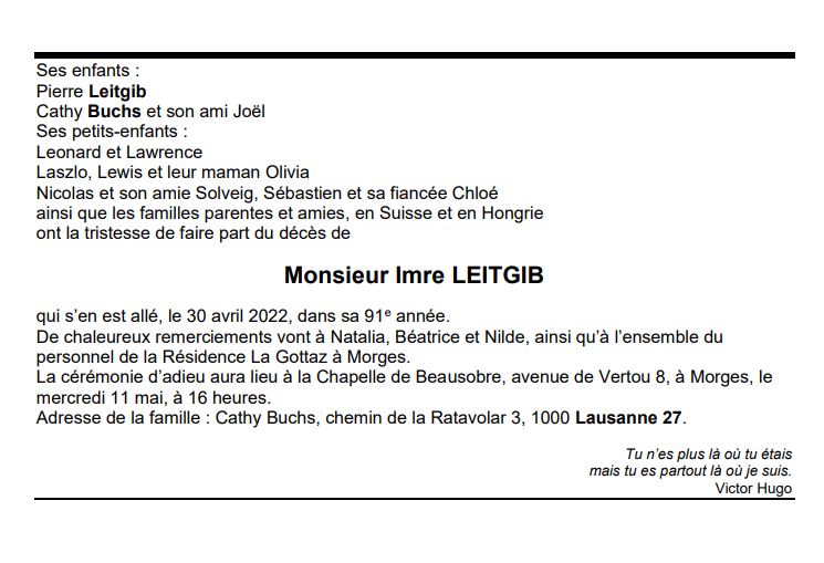 Monsieur Imre LEITGIB 24 oct. 1931 - 30 avr. 2022 Avis mortuaire PFG Télecharger PDF Partager sur: Galerie PreviousNext PreviousNext