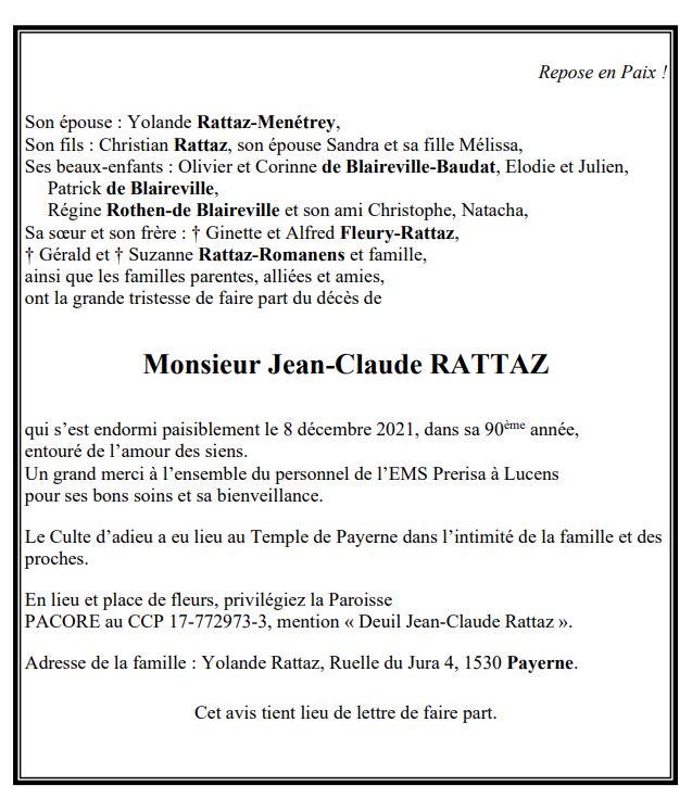 Monsieur Jean-Claude RATTAZ 04 nov. 1932 - 08 déc. 2021 Avis mortuaire PFG Télecharger PDF Partager sur: Galerie PreviousNext PreviousNext
