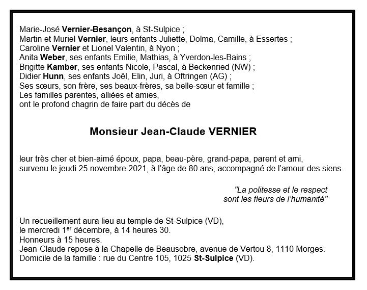 Monsieur Jean-Claude VERNIER 27 oct. 1941 - 25 nov. 2021 Avis mortuaire PFG Télecharger PDF Partager sur: Galerie PreviousNext PreviousNext