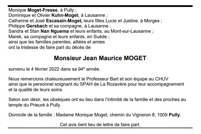 Monsieur Jean Maurice MOGET 03 déc. 1928 - 04 fév. 2022 Avis mortuaire PFG Télecharger PDF Partager sur: Galerie PreviousNext PreviousNext