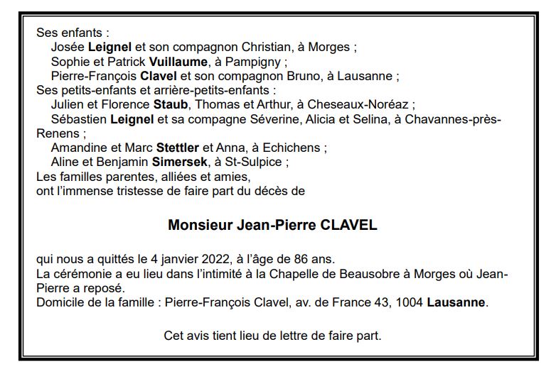 Monsieur Jean-Pierre CLAVEL 15 avr. 1935 - 04 jan. 2022 Avis mortuaire PFG Télecharger PDF Partager sur: Galerie PreviousNext PreviousNext
