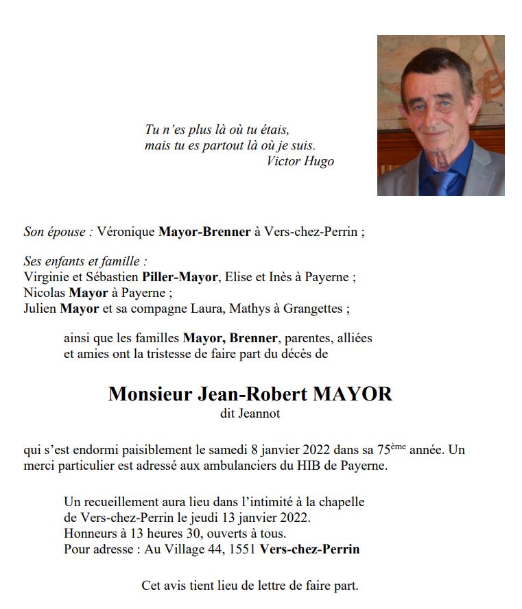 Monsieur Jean-Robert MAYOR 27 juil. 1947 - 08 jan. 2022 Avis mortuaire PFG Télecharger PDF Partager sur: Galerie PreviousNext PreviousNext