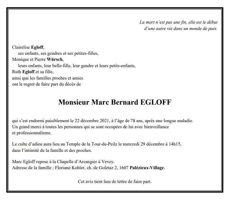Monsieur Marc Bernard EGLOFF 03 sep. 1943 - 22 déc. 2021 Avis mortuaire PFG Télecharger PDF Partager sur: Galerie PreviousNext PreviousNext