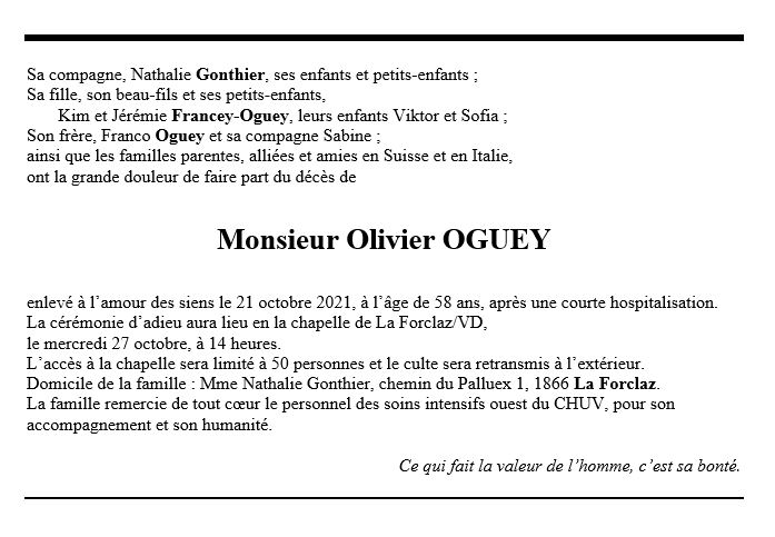 Monsieur Olivier OGUEY 31 oct. 1963 - 21 oct. 2021 Avis mortuaire PFG Télecharger PDF Partager sur: Galerie PreviousNext PreviousNext