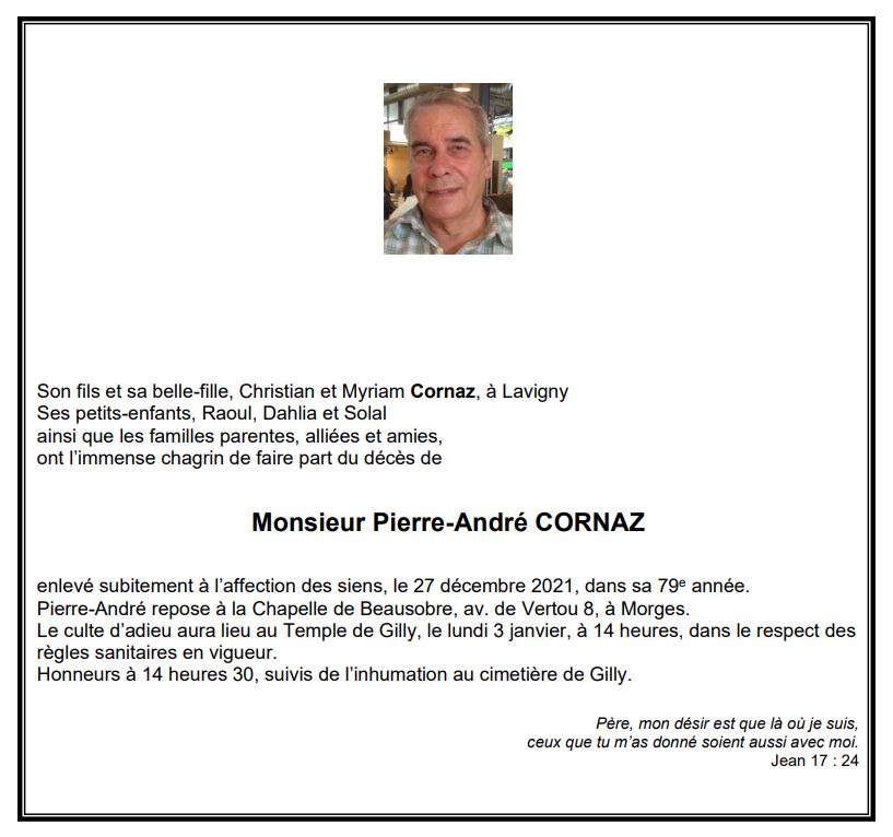Monsieur Pierre-André CORNAZ 29 aoû. 1943 - 27 déc. 2021 Avis mortuaire PFG Télecharger PDF Partager sur: Galerie PreviousNext PreviousNext
