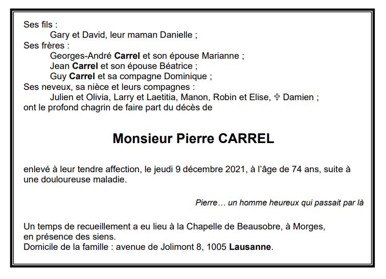 Monsieur Pierre CARREL 03 mai. 1947 - 09 déc. 2021 Avis mortuaire PFG Télecharger PDF Partager sur: Galerie PreviousNext PreviousNext